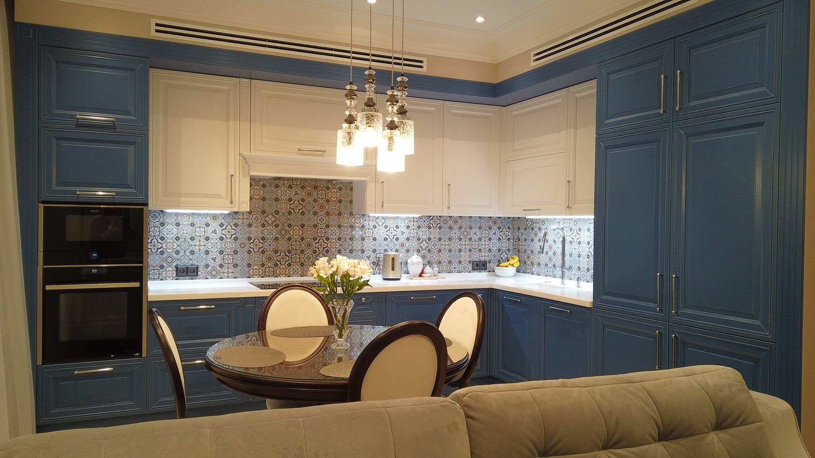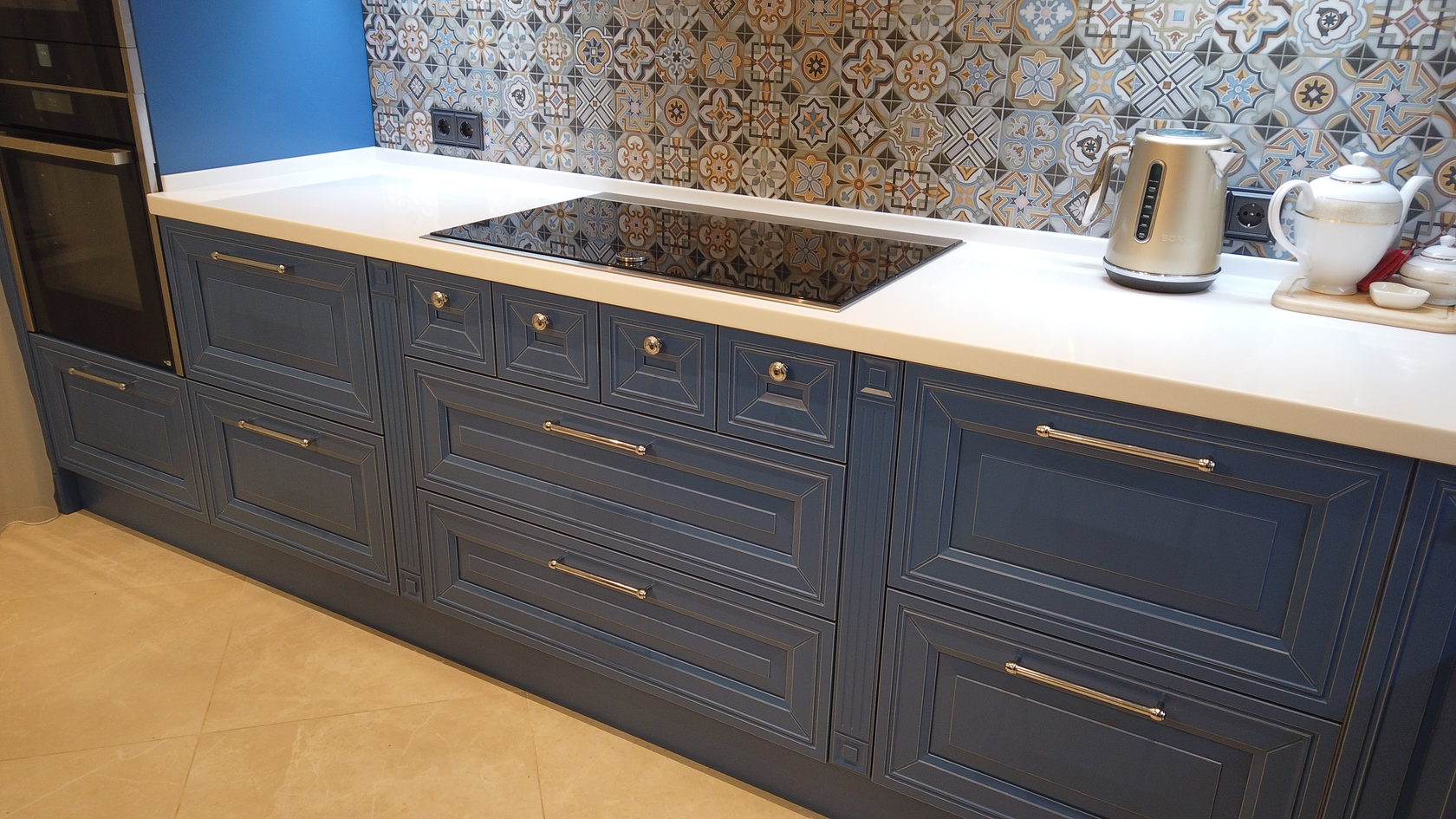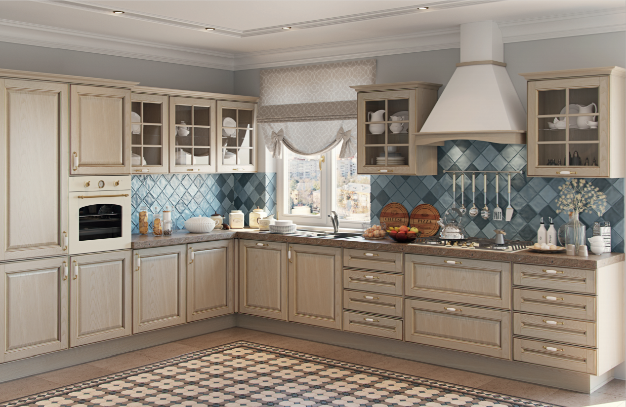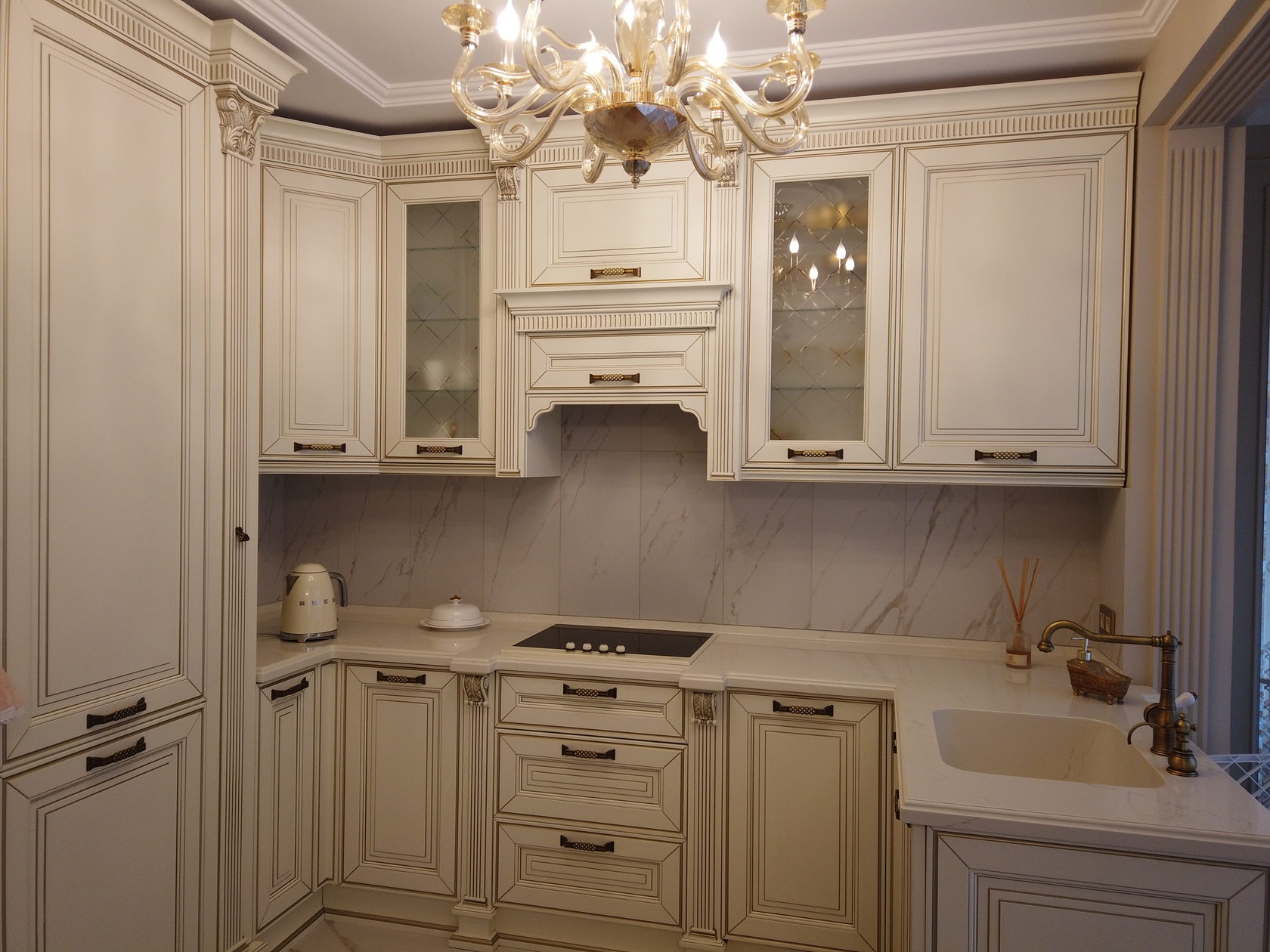 Материал фасадов: МДФ, покрытый эмалью + ручная отделка покрытия фасадов протиром или патиной.