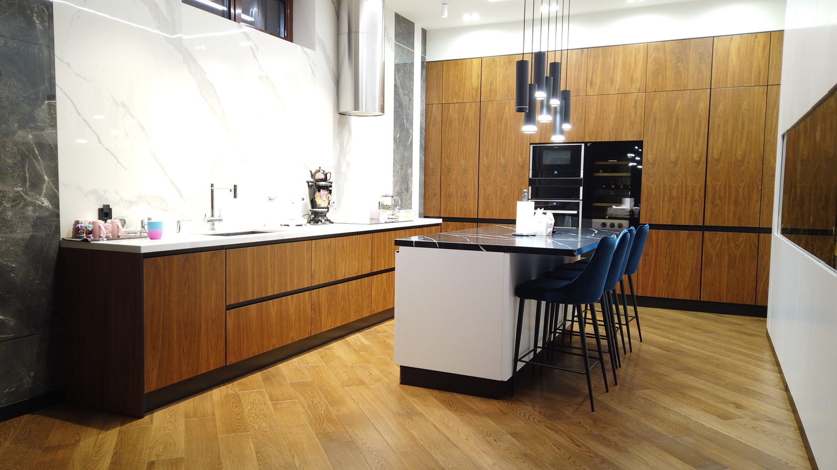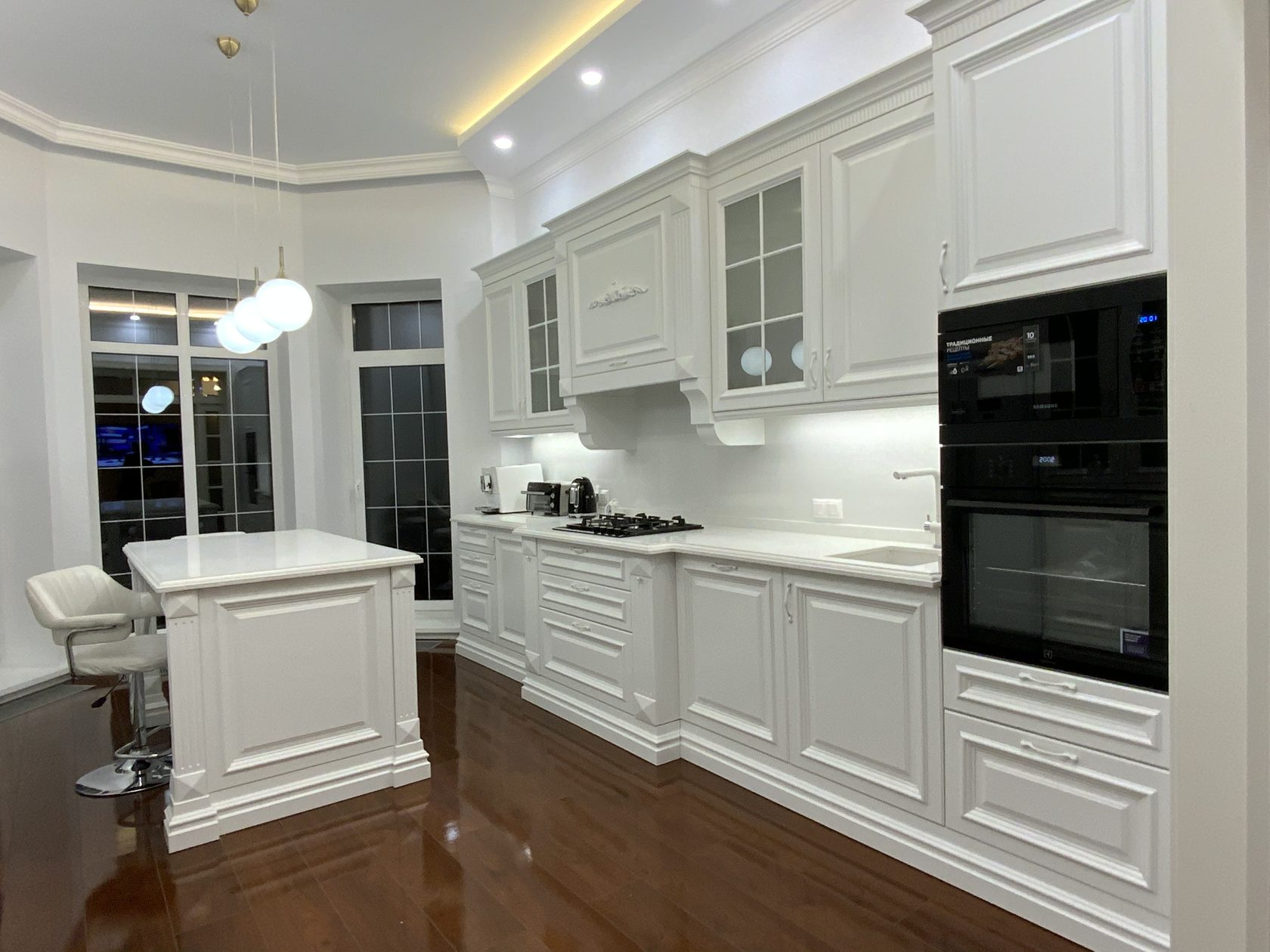 Кухня «Афина»- элегантная и престижная представительница лучших традиций классического стиля. Блестящее сочетание практичных современных материалов и строгих линий фасадов, изящных декоративных элементов и функциональности наполнения не оставит равнодушными истинных поклонников классики.